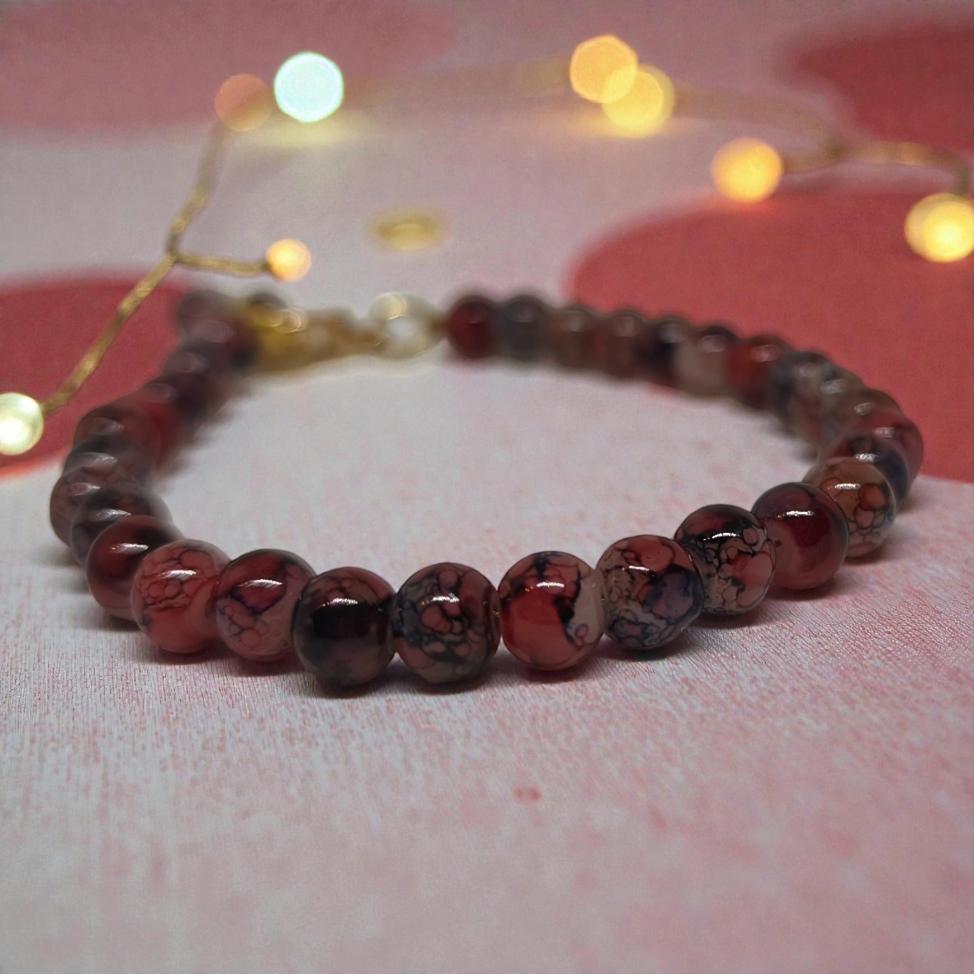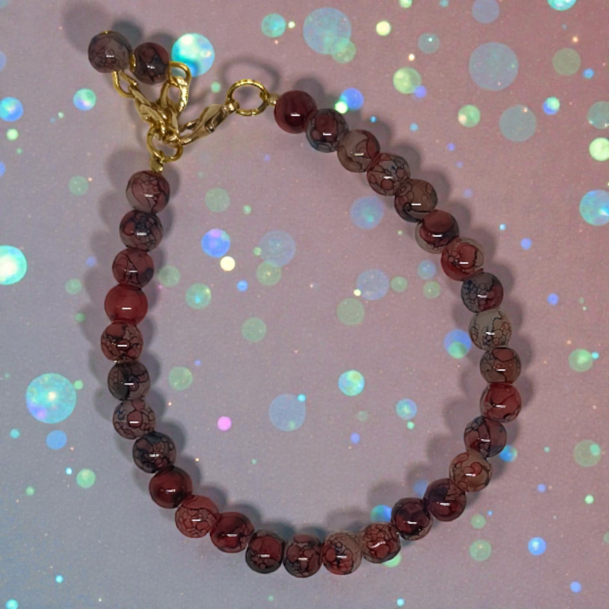 Γυάλινες χάντρες σε βαθιά κόκκινα και καφέ. Χρυσό κούμπωμα που προσθέτει λάμψη. Φόρεσέ το και νίωσε τη διαφορά.