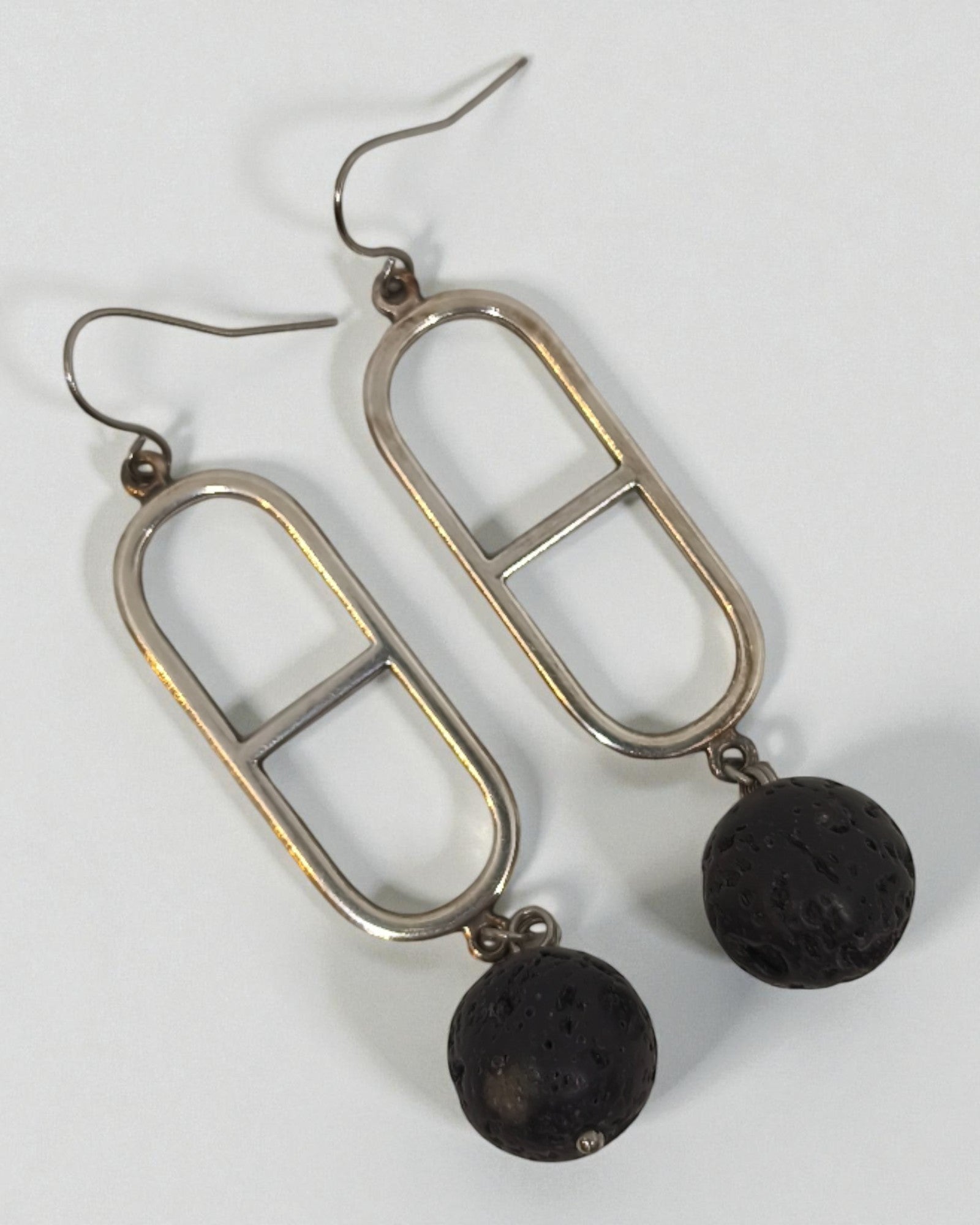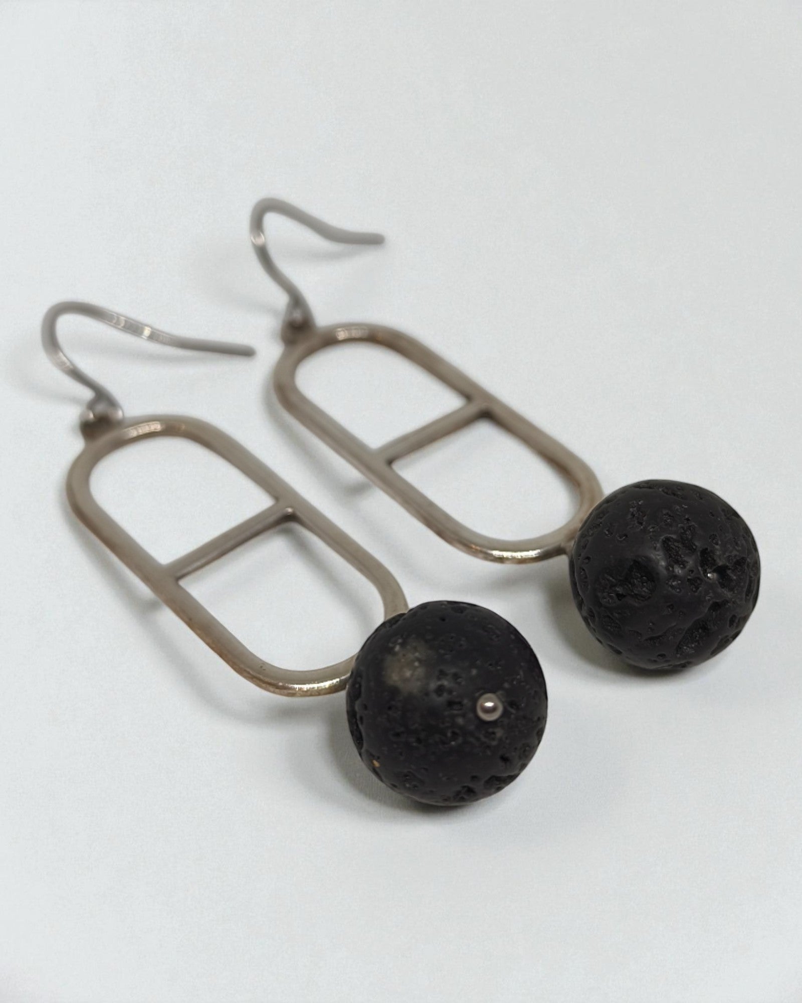 Μοντέρνα κρεμαστά σκουλαρίκια με γεωμετρικό μεταλλικό σχήμα και φυσική μαύρη λάβα. Ο συνδυασμός του minimal design με την οργανική υφή της λάβας δημιουργεί ένα ξεχωριστό αποτέλεσμα.