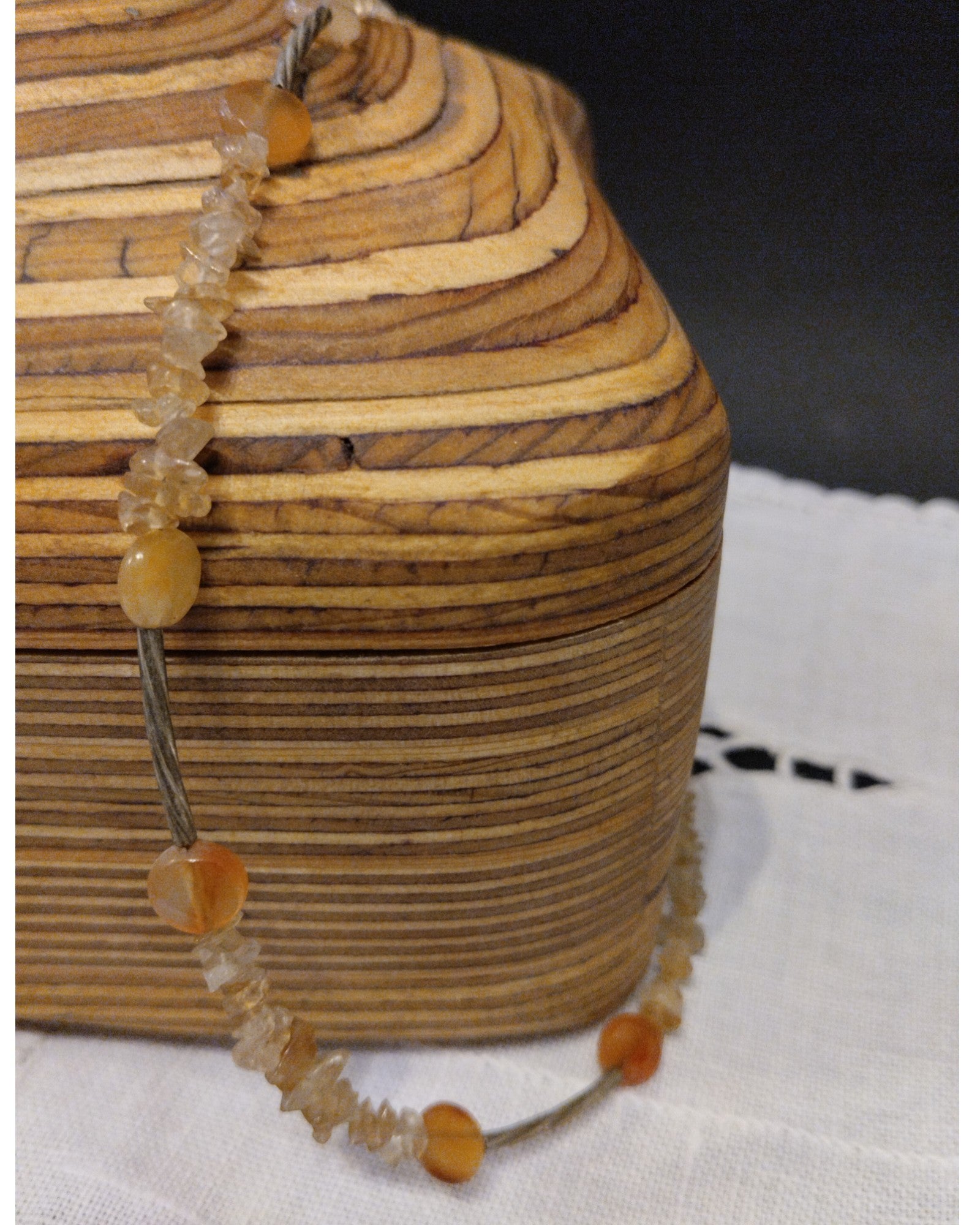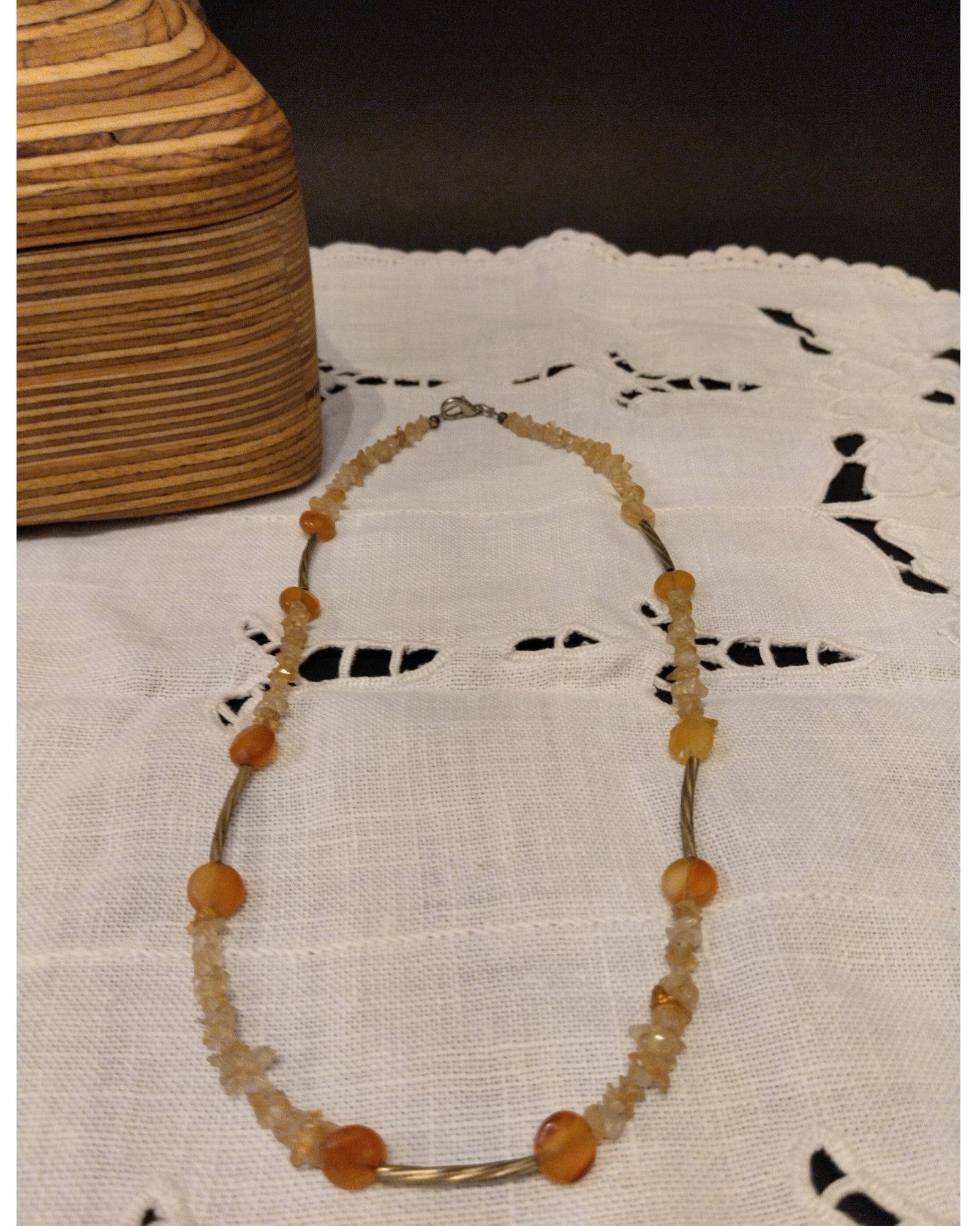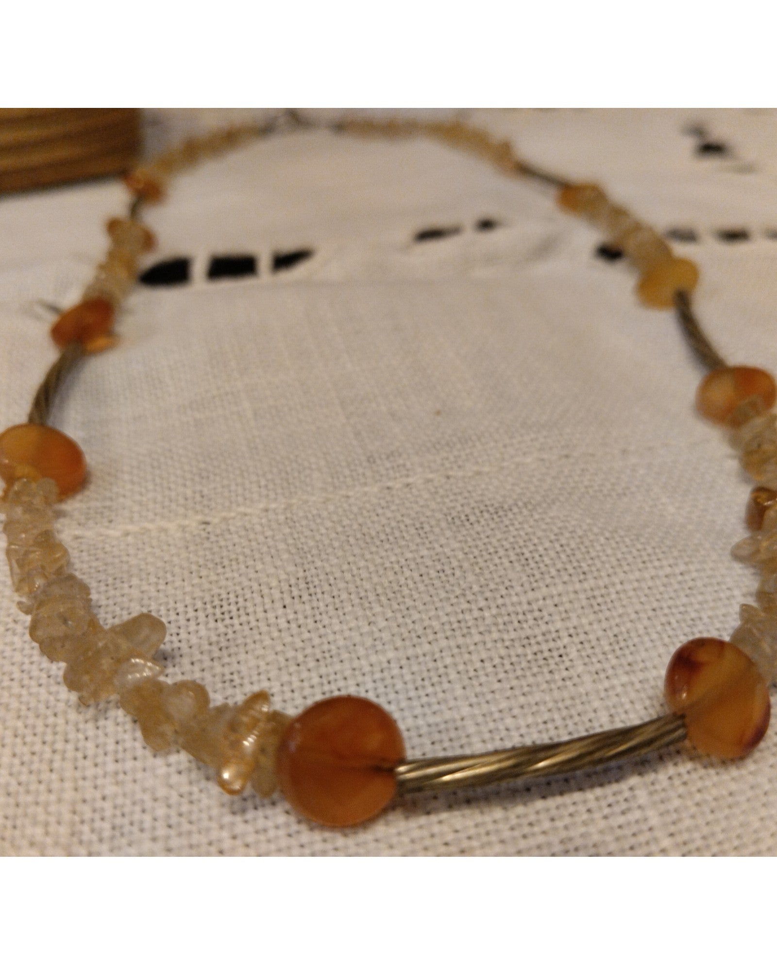 Ένα εντυπωσιακό κολιέ που συνδυάζει φυσικές κίτρινες πέτρες με μεταλλο σε χρυσή απόχρωση. Οι ζεστές αποχρώσεις του κίτρινου και του χρυσού δημιουργούν μια αρμονική σύνθεση που φωτίζει κάθε εμφάνιση. Ιδανικό για να προσθέσεις λάμψη στην καθημερινότητά σου.
