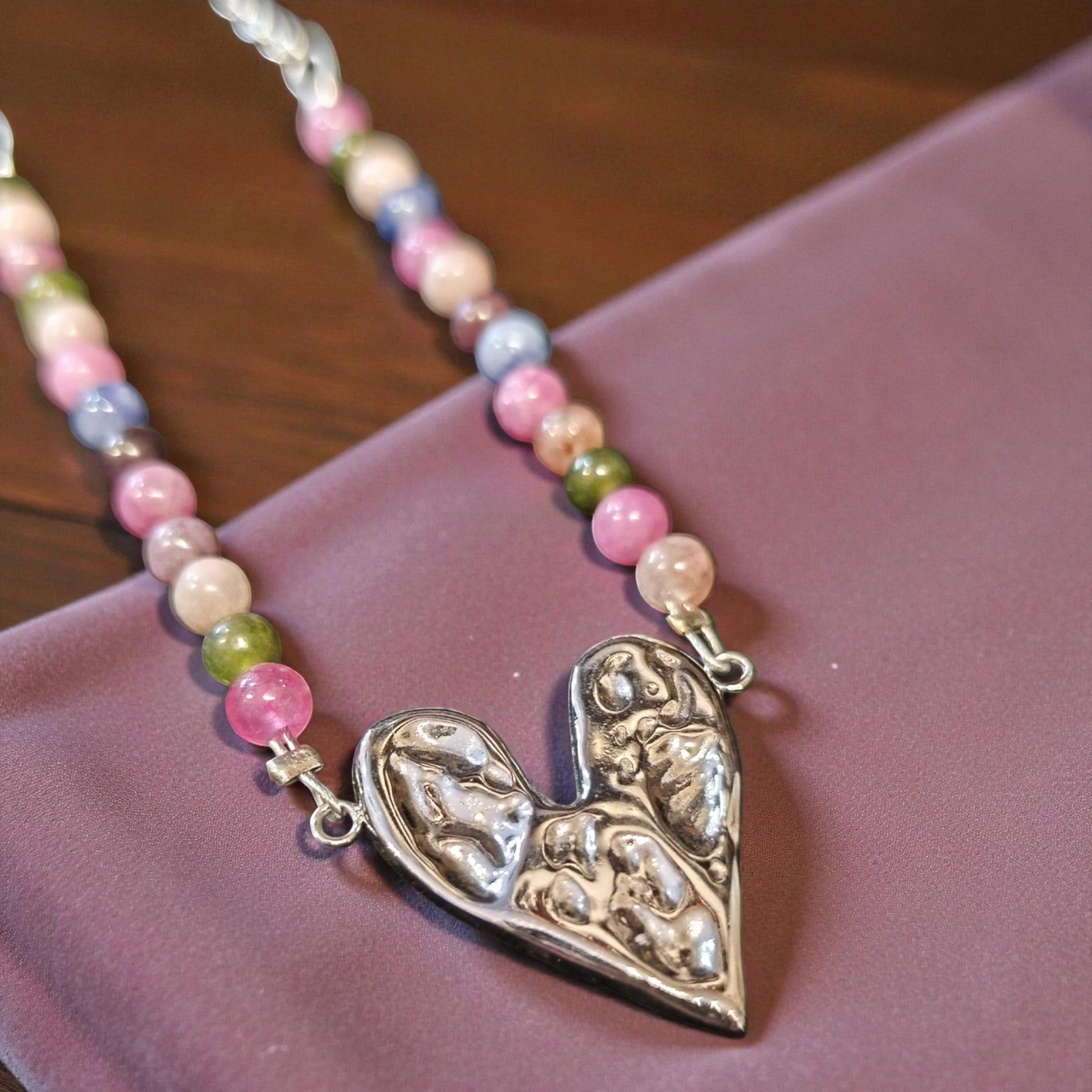 Καρδιά από ατσάλι με πολύχρωμους ημιπολύτιμους λίθους σε παστέλ αποχρώσεις. Ροζ, λιλά, πράσινο, μπεζ. Μια σύνθεση που φέρνει χρώμα στην καθημερινότητα. Φόρεσέ το και ξεχώρισε.
