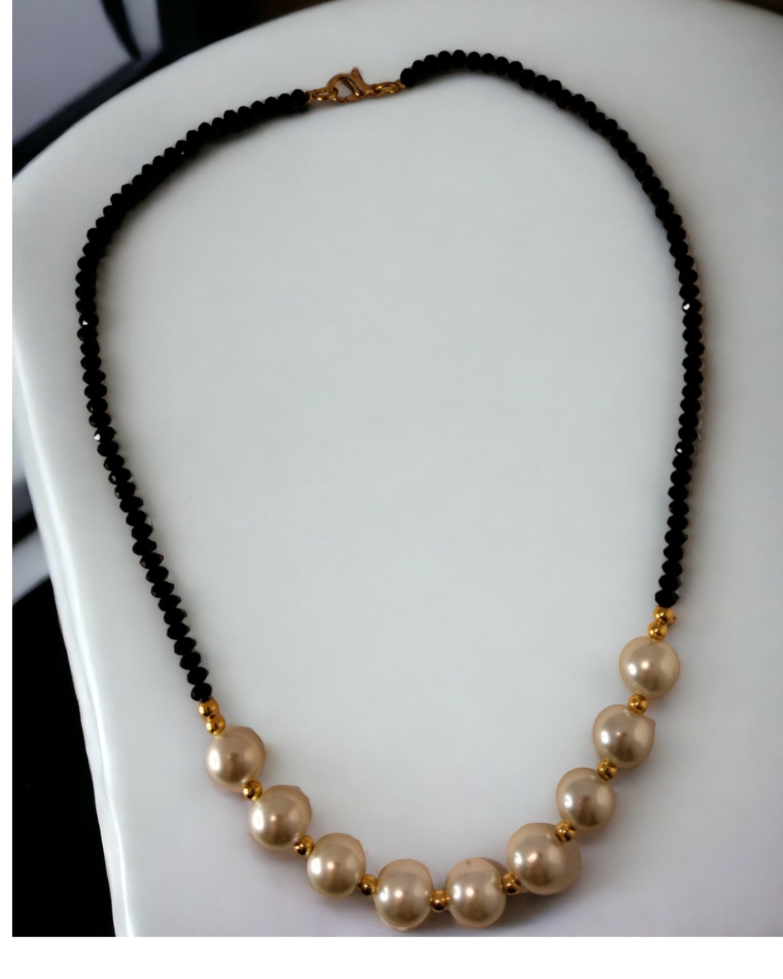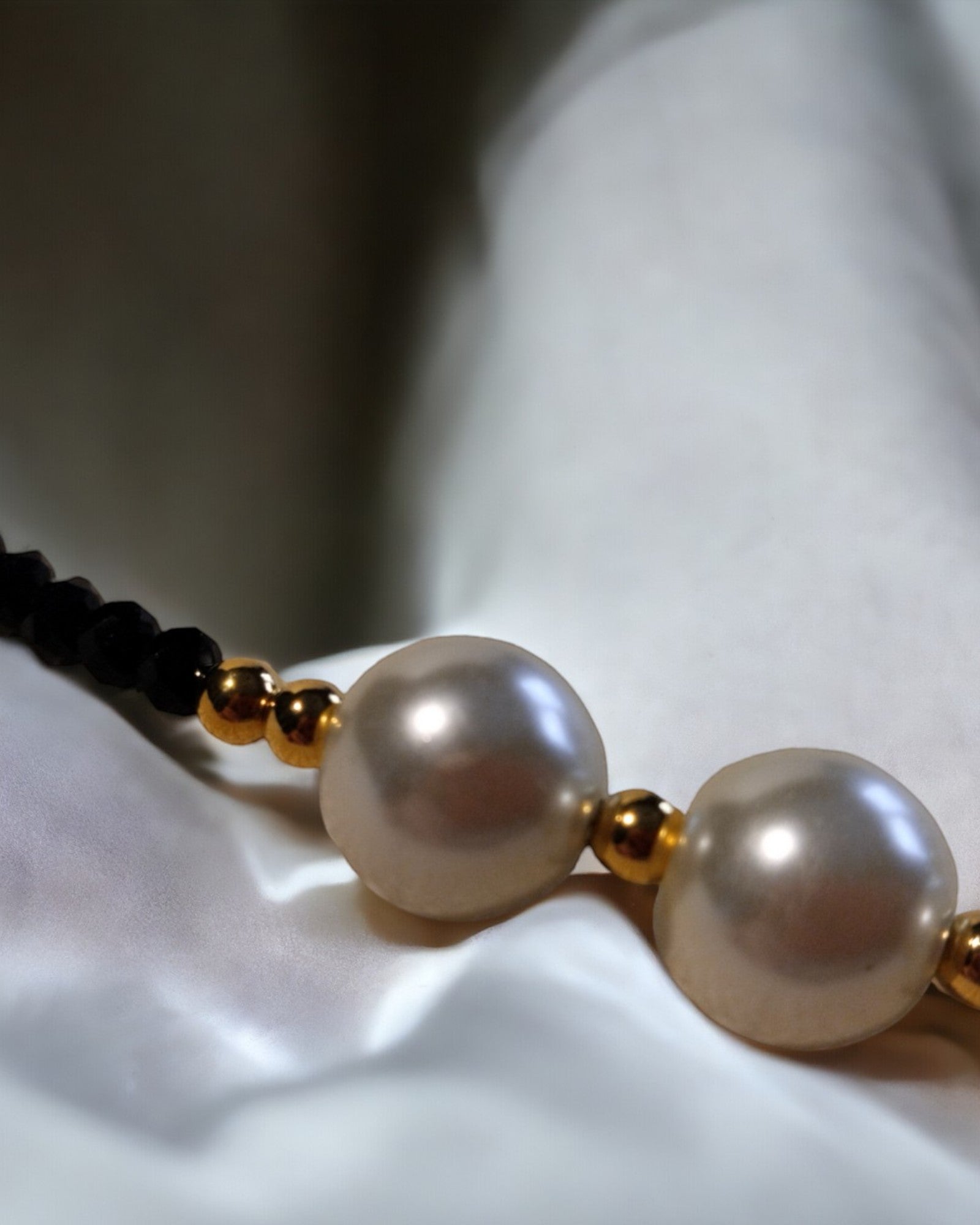 Ένα κομψό κολιέ που συνδυάζει την κλασική ομορφιά της πέρλας με μαύρες χάντρες και λεπτές χρυσές λεπτομέρειες. Η τέλεια επιλογή για να προσθέσετε κομψότητα και στυλ σε κάθε σας εμφάνιση.