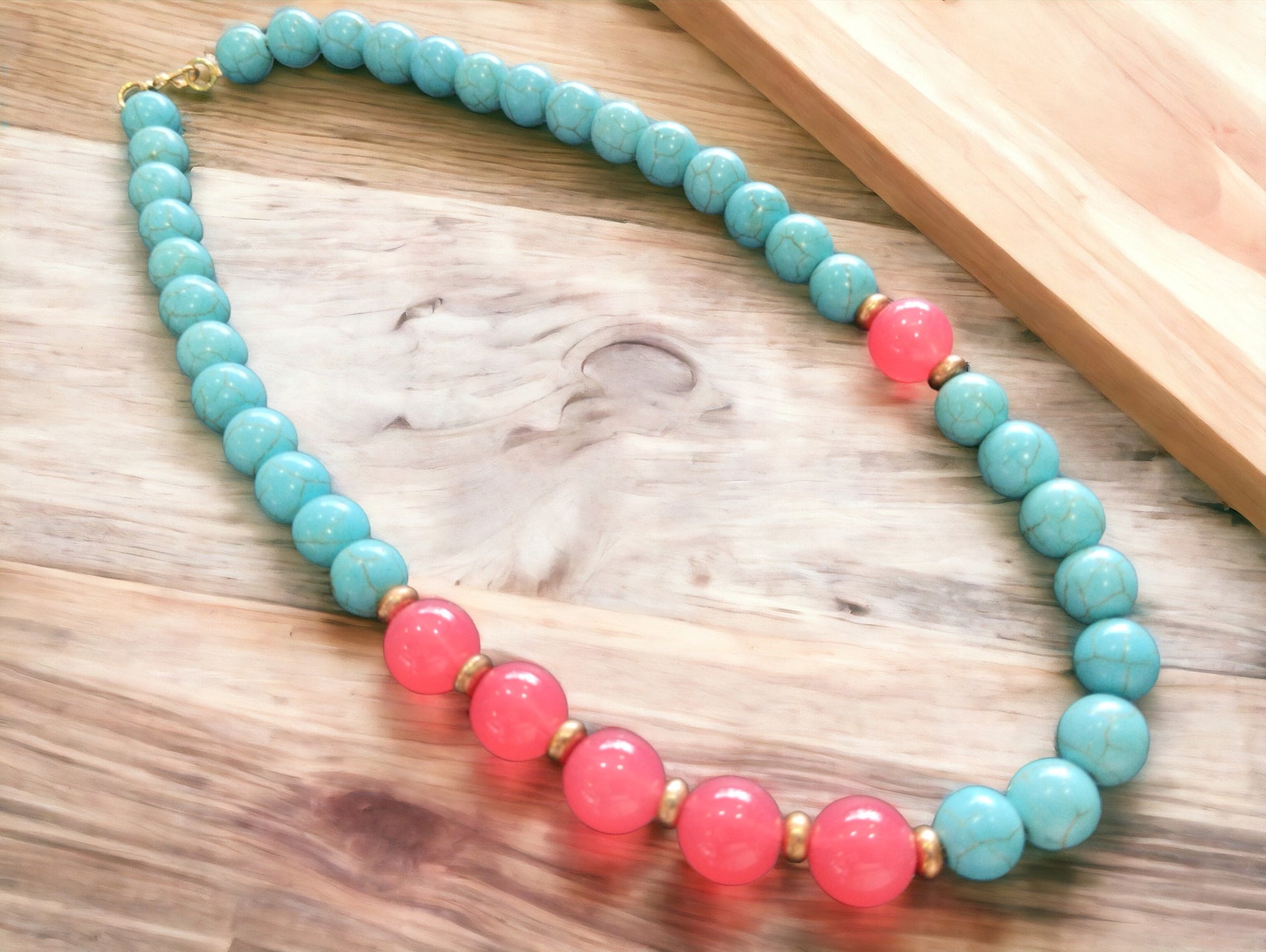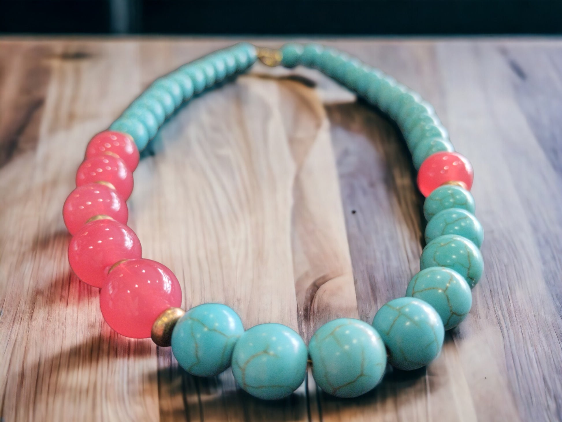 Αυτό το κολιέ φέρνει μαζί του τη ζεστασιά του κόκκινου και τη δροσιά του τιρκουάζ. Ένα bold choice για όσες δεν φοβούνται να ξεχωρίσουν.
