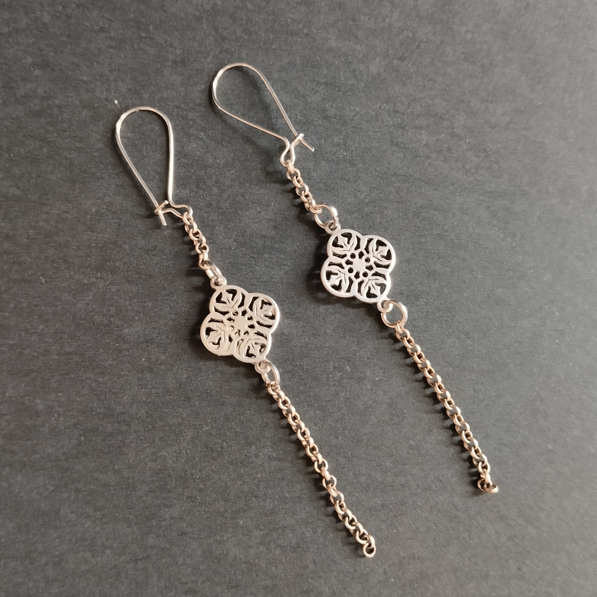 Ξεχωριστά μακριά σκουλαρίκια που συνδυάζουν λεπτή αλυσίδα με μοναδικό μεταλλικό διακοσμητικό. Ο σχεδιασμός τους προσθέτει κίνηση και ενδιαφέρον σε κάθε σας εμφάνιση.