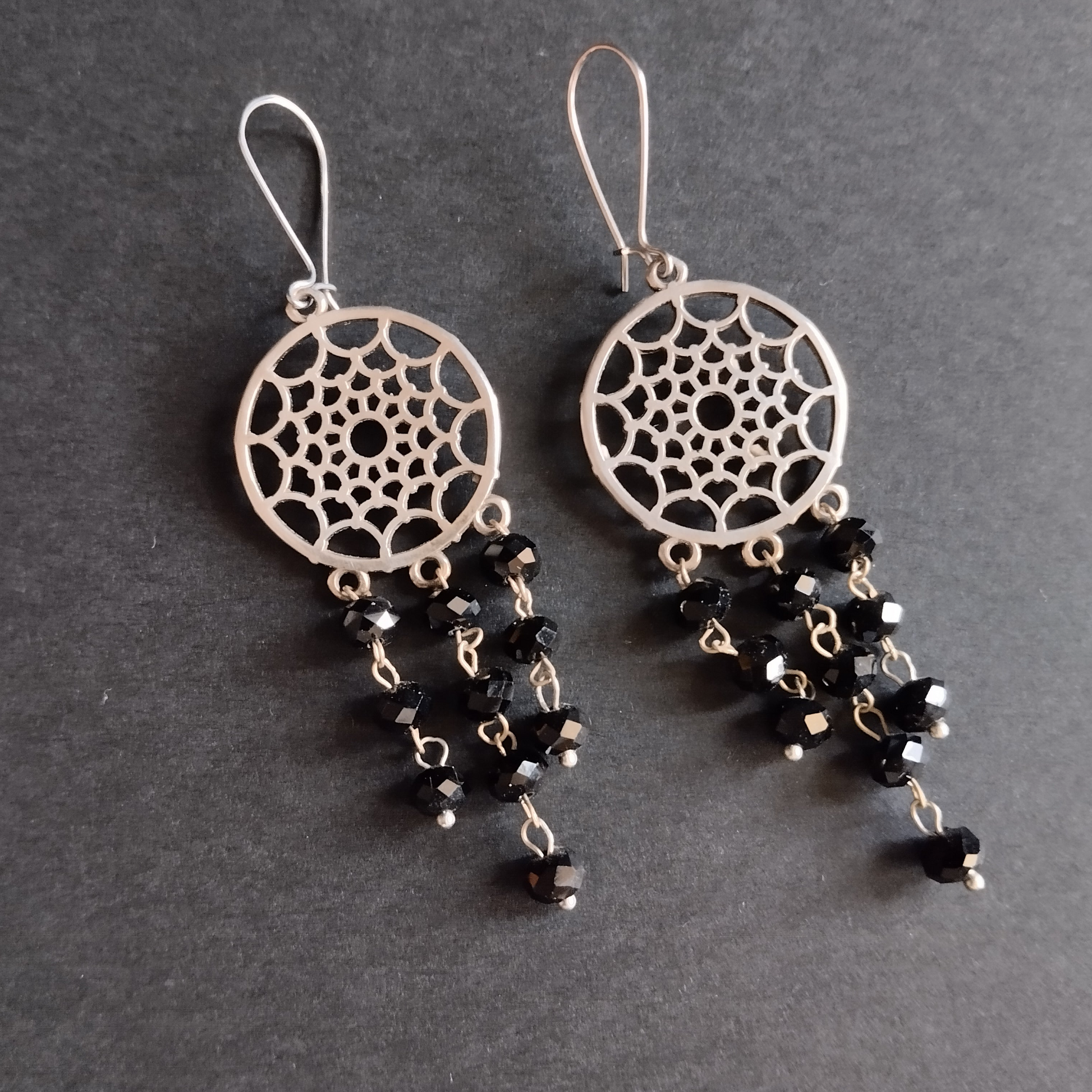Ξεχωριστά σκουλαρίκια που συνδυάζουν το boho πνεύμα με μια πινελιά μυστηρίου. Οι ονειροπαγίδες στολισμένες με μαύρες χάντρες δημιουργούν ένα μακρύ, κομψό σχέδιο που τραβάει τα βλέμματα.