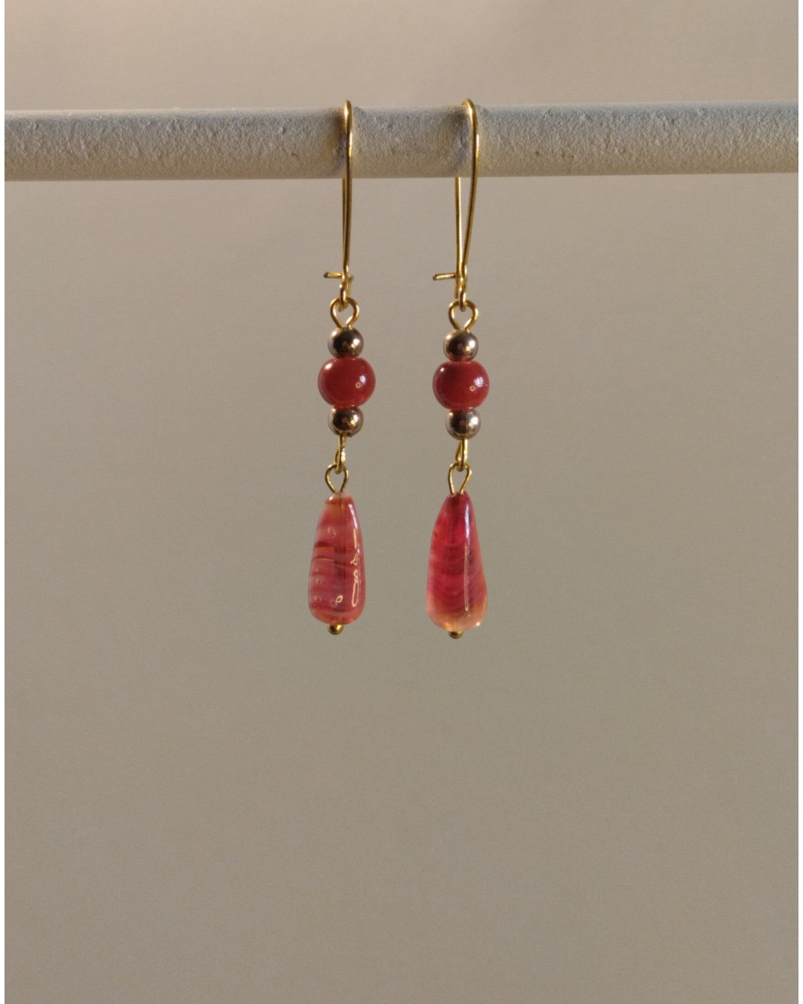 Εκλεπτυσμένα σκουλαρίκια με βυσσινί πέτρες που συνδυάζονται αρμονικά με χρυσές λεπτομέρειες. Το σχέδιο με τις διαφορετικές φόρμες πετρών δημιουργεί ένα μοναδικό και κομψό κόσμημα. Ιδανικά για να προσθέσετε χρώμα και στυλ στην εμφάνισή σας.