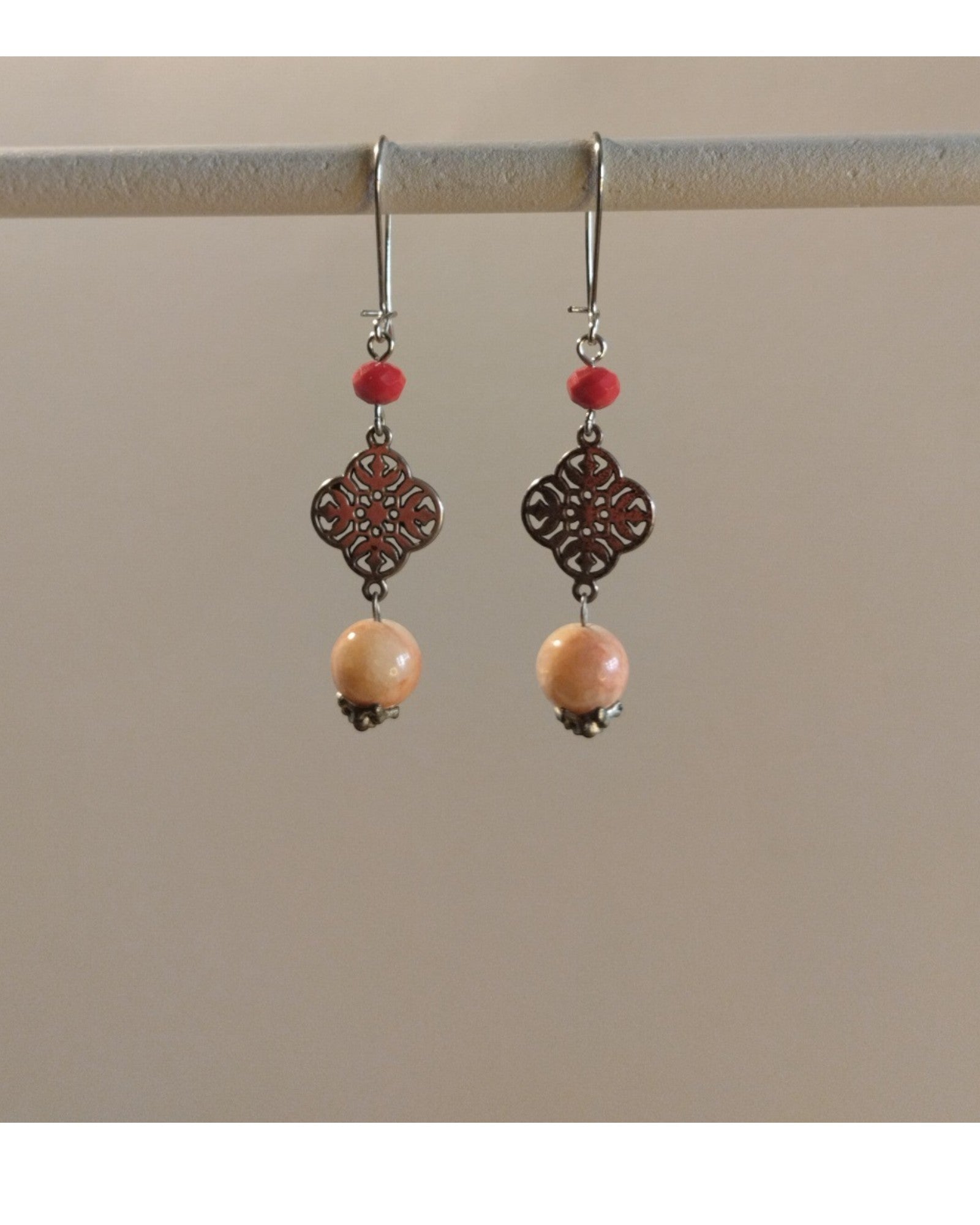 Εκλεπτυσμένα σκουλαρίκια με κόκκινες και ροζ πέτρες που συνδυάζονται με διακοσμητικό μεταλλικό μοτίβο. Το λεπτό σκάλισμα στο ασημένιο στοιχείο προσθέτει μια νότα κομψότητας. Ιδανικά για να ξεχωρίσετε με στυλ και χρώμα.