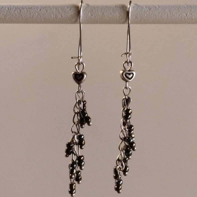 Αυτά τα μακριά σκουλαρίκια συνδυάζουν την κομψότητα των μαύρων χαντρών με τη λάμψη των μεταλλικών καρδιών.